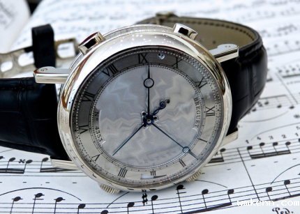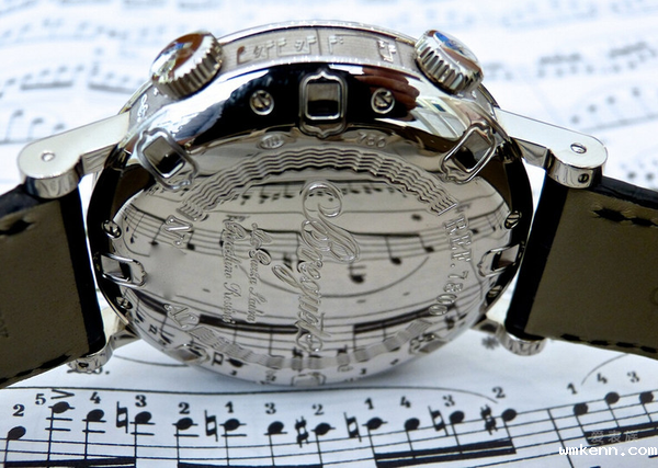 腕表的表盘上拥有3根指针,但却并不是正常的时、分、秒3根指针,而是时、分针和一根闹铃指示设置针,可通过4点钟位置的表冠调节闹铃时间。从侧面我们可以看到这一款腕表并没有采用宝玑经典的钱币纹设计,而是刻上了很多音乐符号。宝玑将“谱曲”刺针置于一个固定于手工镌刻表盘底面的机板上,一旦激活响铃功能,表盘就会旋转20秒,正好完成旋转一圈,也就是音乐的长度。