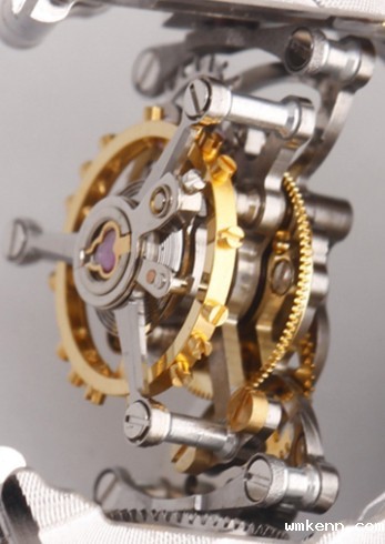 3.外轴陀飞轮框架旋转速度为每2.5分钟转动一周,以此速度来设计的目的是为了给人视觉上更强烈的冲击力,体验机械带来的动态美感,让人有更丰富的满足感。双轴陀飞轮的结构已经获得了国家发明专利的授权(专利号:ZL201110142886.X),同时也申请了PCT国际专利;