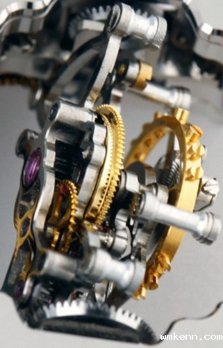 1)这个名字。外轴框架两端的支承轴宛如翅膀的造型,而陀飞轮夹板形状也是以翅膀作为原型设计的,使得外轴框架的整体设计充分体现了寓意里的“展翅翱翔”;“实现梦想”由内陀飞轮框架表现,最上层夹板的造型是星型,代表星空,寓意“梦想”。