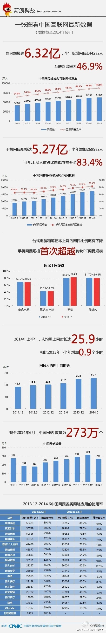 报告显示,截至2014年6月,我国网民规模达6.32亿,较2013年底增加1442万人。互联网普及率为46.9%,较2013年底提升了1.1个百分点。