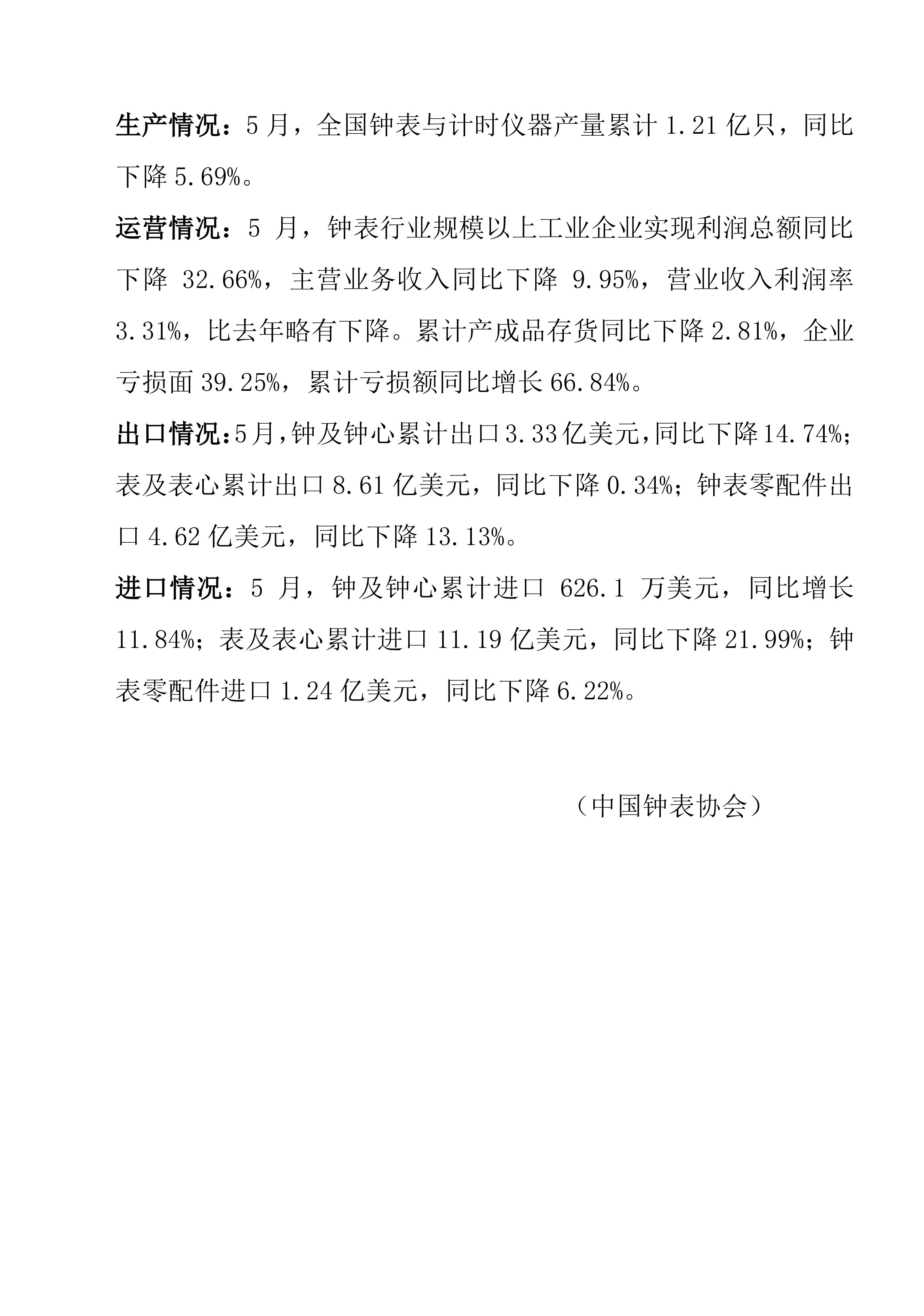 2025年5月钟表行业经济运行简报