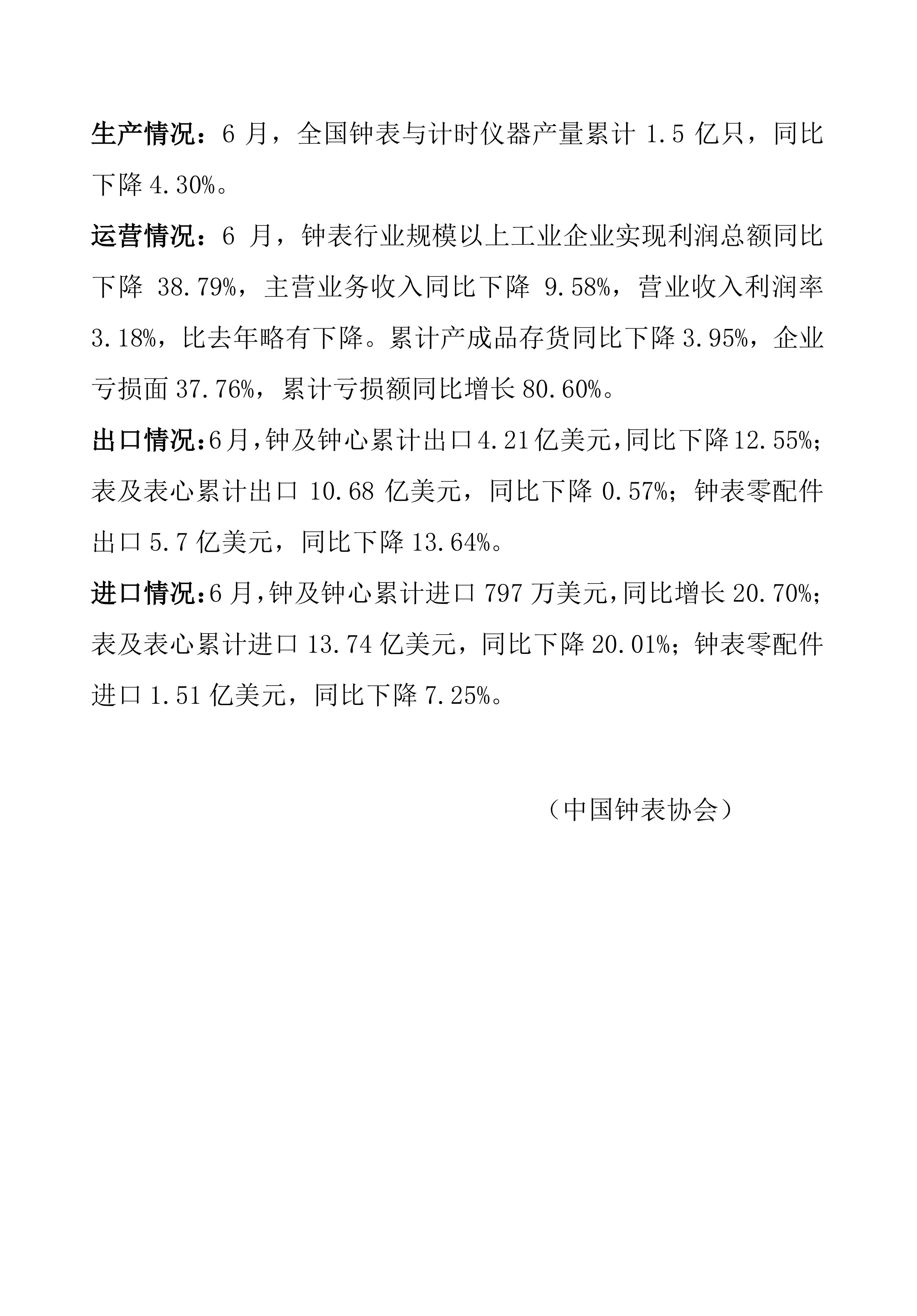 2025年6月钟表行业经济运行简报