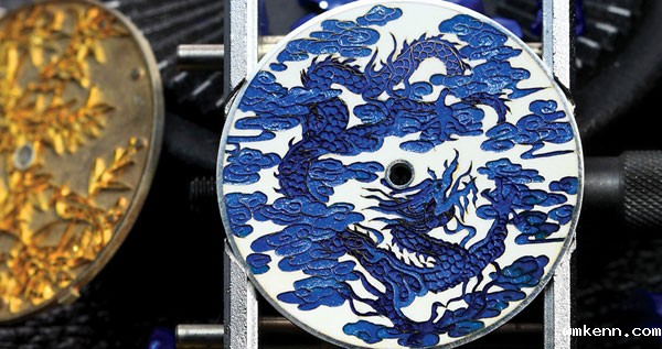 “与传统的景泰蓝工艺相比,珐琅表盘所需的工艺要求是更高的。这其中的差别不仅表现在釉料上,掐丝也非常精细。比如,瑞士制造的掐丝珐琅表盘的金丝厚度是7丝,也就是0.07毫米,而我们最终研究出来的金丝厚度仅有0.04毫米。在纯银或金胎上勾勒出所要的图案。丝越细加工难度越高,因为根本就无法看清,但是丝越细,勾勒出图案的效果越好,表现的内容就越丰富。”熊松涛说。