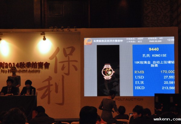 2014年12月4日上午,北京保利秋拍名贵腕表及西洋古董座钟专场拍卖在北京四季酒店举锤。此前备受关注的中国原创艺术腕表品牌——孔氏珐琅旗下两款拍品——“盘龙云海”和“锦绣前程”均被拍出,其中锦绣前程以人民币195,500元(含佣金)被场内收藏家竞得,这是继保利厦门秋拍后,孔氏拍品再次全部被拍出。